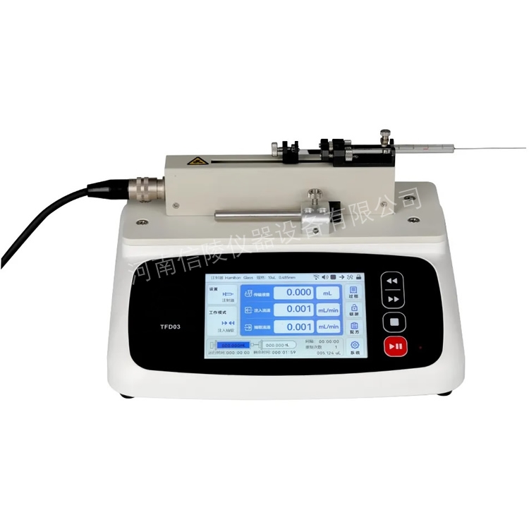 TFD03-01实验室科研分体式注射泵,由控制器和执行单元两部分组成,结构精巧,精度高,运行稳定;控制器和执行单元分离,通过线缆连接,并配有快插接头,方便拆装,可以与其他仪器、设备联合使用,例如脑立体定位仪;操作界面采用5英寸高分辨率彩色液晶触摸屏,同屏幕显示传输液量、剩余液量、流量、运行方向、注射器规格等,动画显示运行状态;流量范围:0.005nL/min(10µL)-152.456µL/min(100uL),通道数:1个,可搭载一支注射器,具有注射、抽取、先注射后抽取、先抽取后注射、连续循环等工作模式。适合各种匀速精密微量液体加料注入实验。