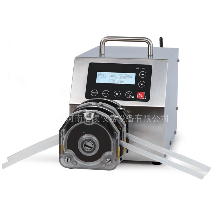 WT300S不锈钢定时调速型蠕动泵,流量范围是0.004~3850mL/min,转速范围是0.1~350rpm,可设置运行时间、间隔时间、循环次数进行定量分装溶液;具有回吸功能:在蠕动泵停止时,为防止管路中的液体滴漏,蠕动泵电机反方向旋转一个角度,将管路内液体进行回吸。具有启停、正反、全速、调速、状态记忆(掉电记忆)等功能;采用直流无刷电机驱动,免维护,动力更强劲,可级联多个泵头。可通过外部模拟量调节转速、控制启停和方向,具有时间分装功能,设定好时间和速度,按照设定的时间运行,定时停止。简易分装控制,实现重复传输定量液体的功能。配有RS485通讯、兼容Modbus协议,更易于与其他控制设备如计算机、人机界面、PLC等连接。用于废水处理、污泥输送、气体处理、污水处理、废水采样和添加化学药剂、监测水样等工作,能够处理污染物浓度较高和含有固体颗粒的废水。也可以应用于液体搅拌、输送和计量,可输送各种化工介质,如酸碱液、溶剂、高温液体和化工废液等。